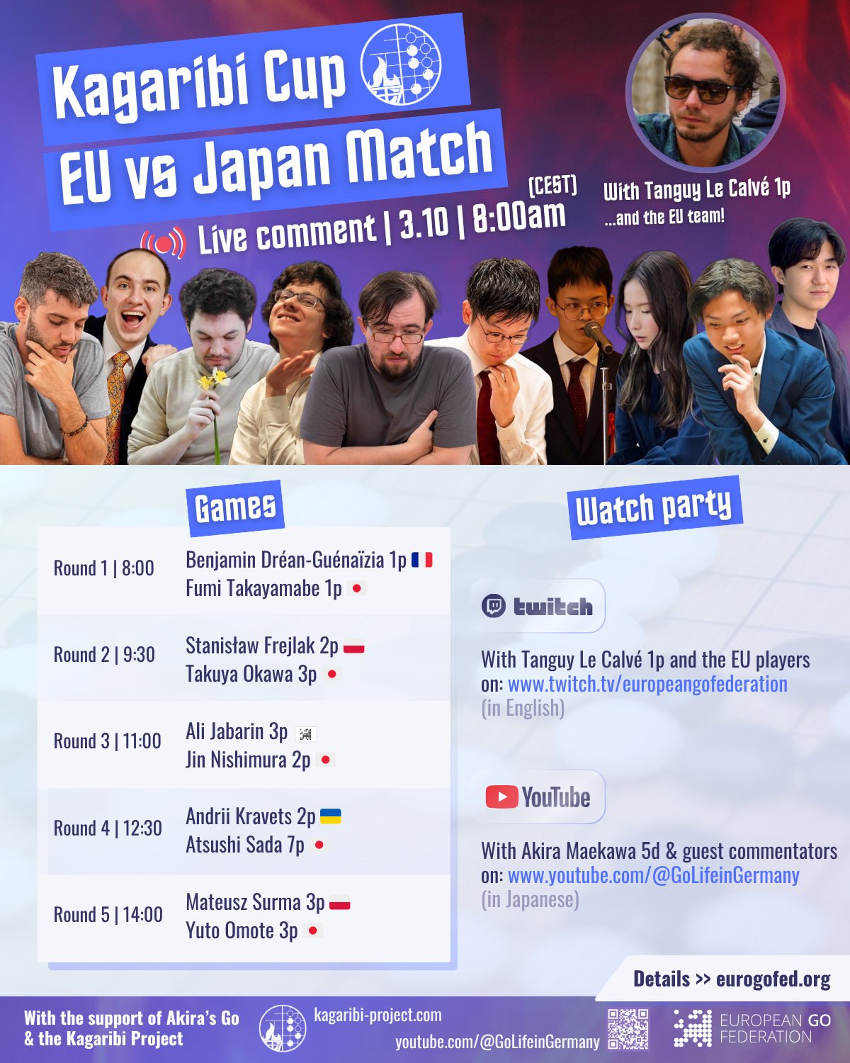 On October 3rd, the 1st Kagaribi Cup, an Online Match between Japanese pros of the Kansai Kiin and EGF pros took place. Despite a bitter 4-1 loss for the Europeans, this match brightened up the entire go community and opens the path to more such international initiatives.