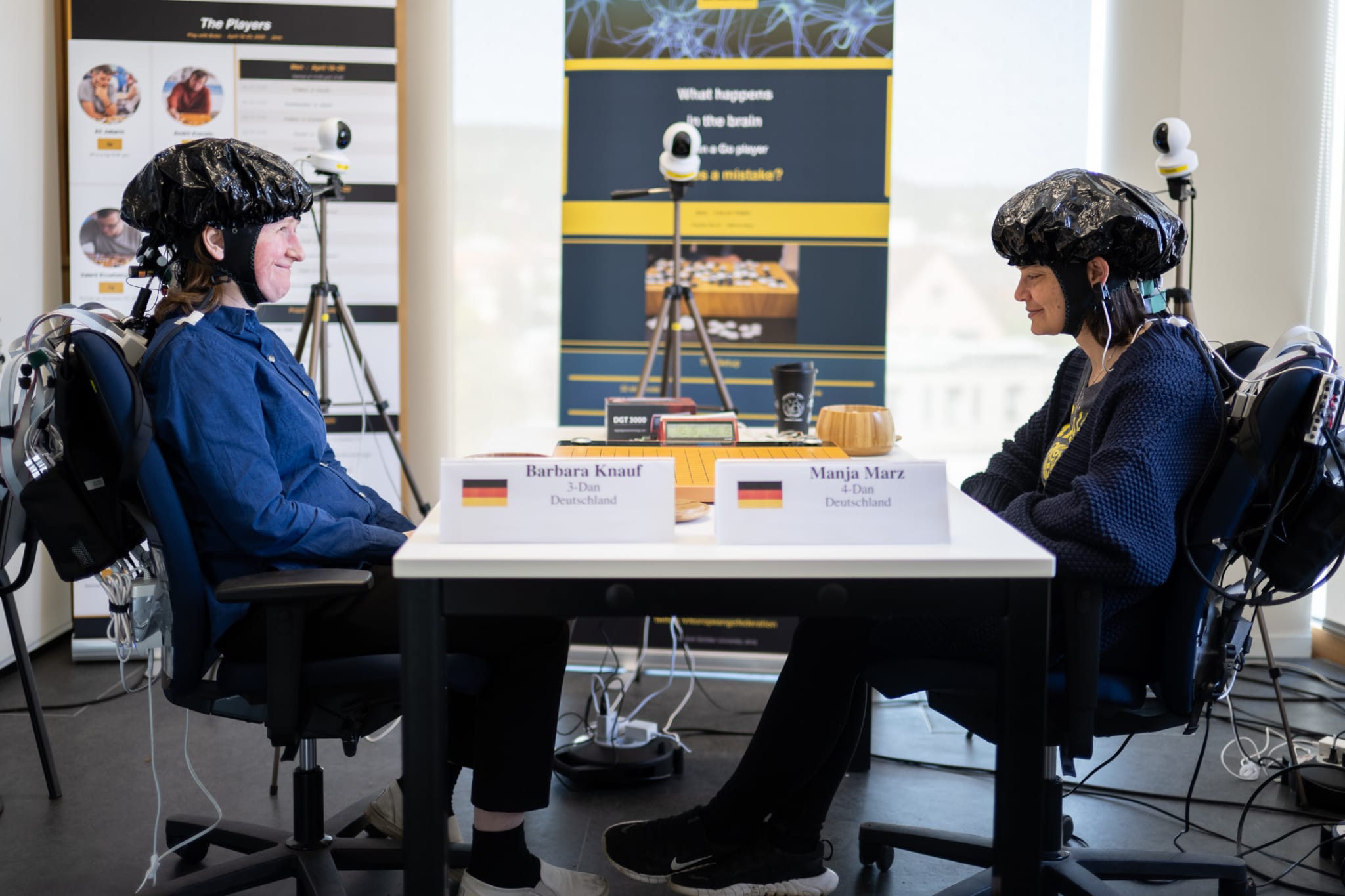 Each player is equipped with a sensor cap containing 32 electrodes that wirelessly sync with the Go boards, capturing brain activity throughout the game. Additionally, players wear an ECG monitor (three sensors on the chest) and a muscle tension sensor on the shoulder.