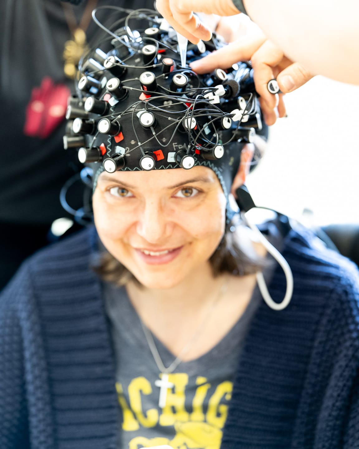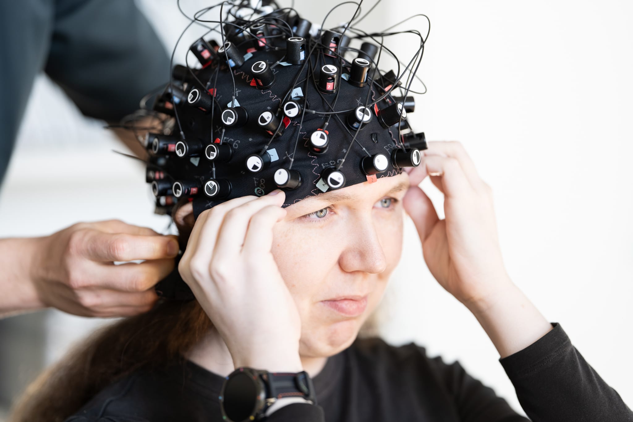 As you may have noticed during the streams, the players wear special equipments. One of them is that "funny hat", which is actually using fNIRS (functional near-infrared spectroscopy) technology, a brain imaging method using harmless light to measure changes in blood oxygenation in the brain (this is why the players have it covered by a black kind of shower hat, to stop external light from disturbing).