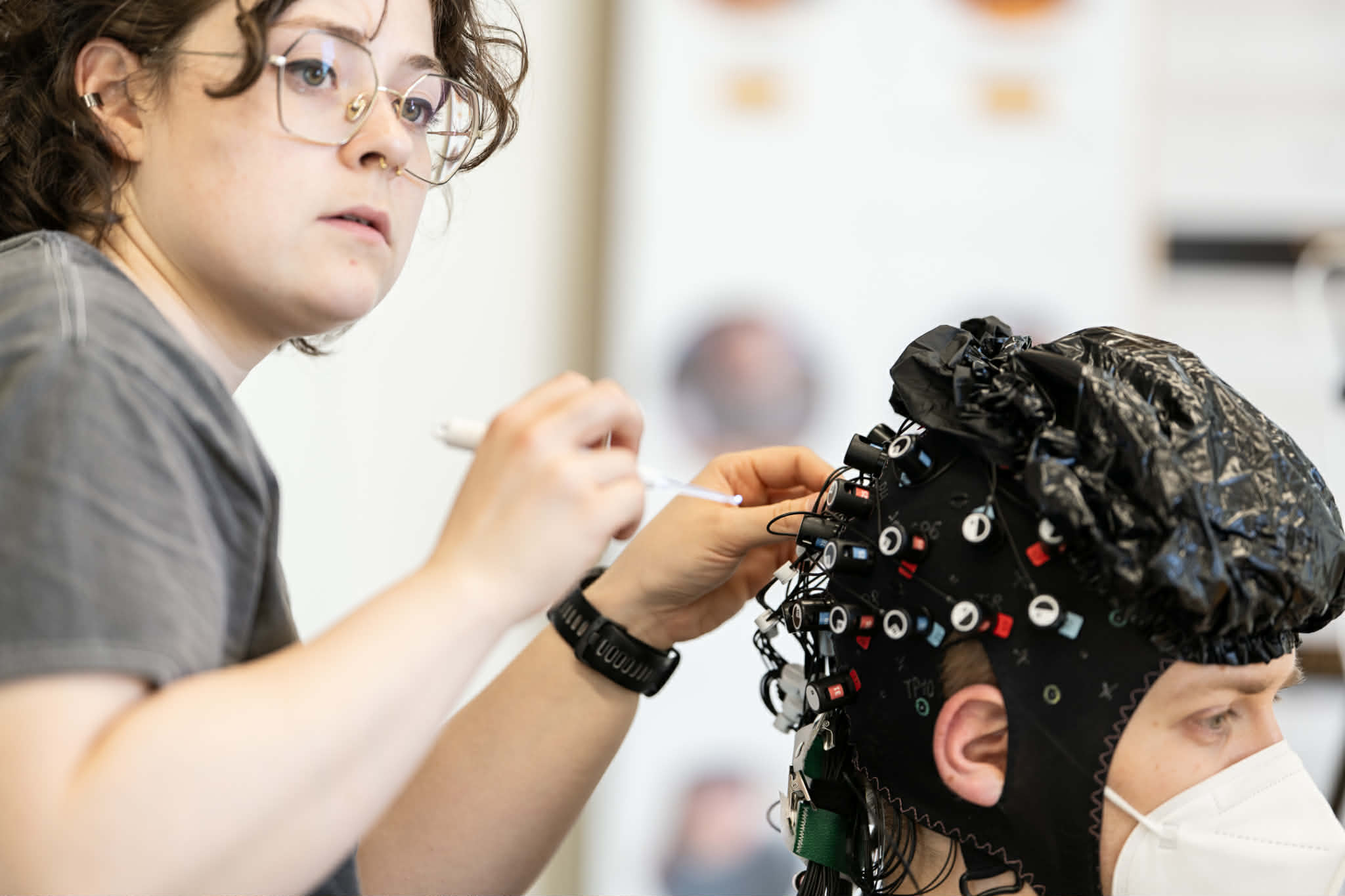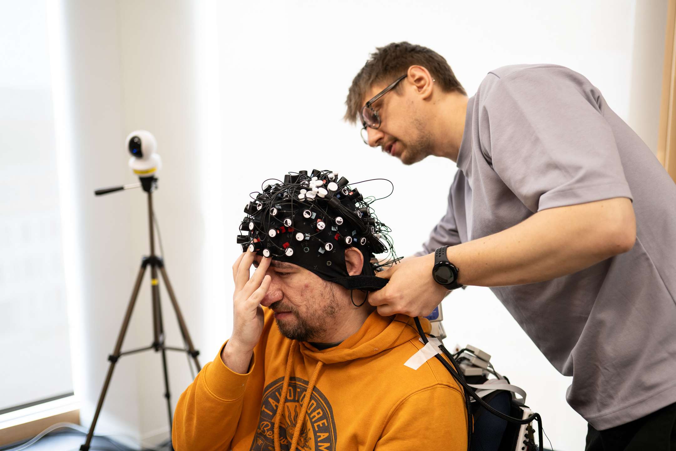As you may have noticed during the streams, the players wear special equipments. One of them is that "funny hat", which is actually using fNIRS (functional near-infrared spectroscopy) technology, a brain imaging method using harmless light to measure changes in blood oxygenation in the brain (this is why the players have it covered by a black kind of shower hat, to stop external light from disturbing).