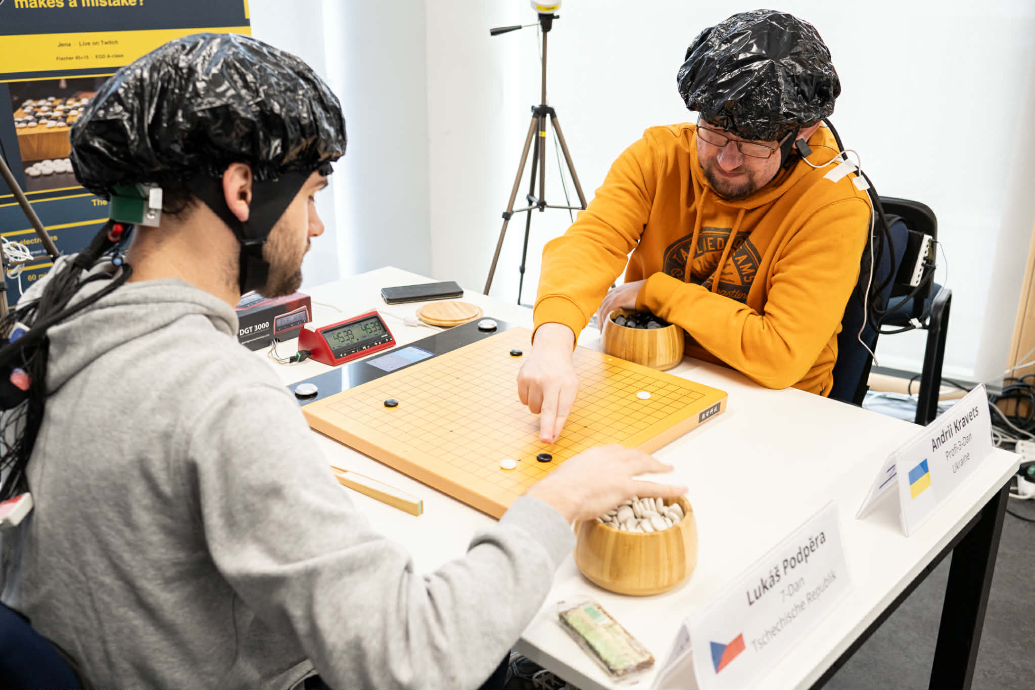 Each player is equipped with a sensor cap containing 32 electrodes that wirelessly sync with the Go boards, capturing brain activity throughout the game. Additionally, players wear an ECG monitor (three sensors on the chest) and a muscle tension sensor on the shoulder.