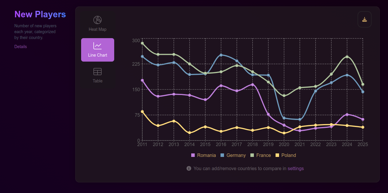 There are some small changes which could also help with analysing the data. For example, it might be helpful to allow filtering out of the major European tournaments (like the EGC etc.), since these have a massive impact in each country when they happen—which in turn can obscure overall trends.