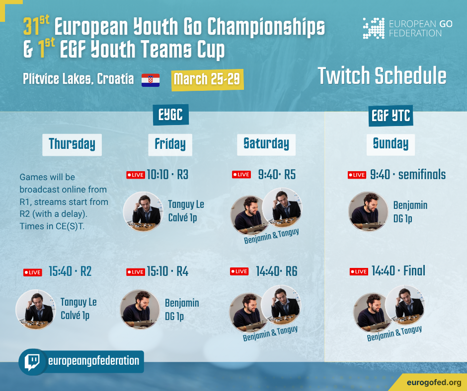 Top boards of the EYGC and Teams Cup will be broadcast online on OGS (EGF account), gogameslive.eu and IZIS servers, and with live commentary (from round 2) by professional players Tanguy Le Calvé 1p and Benjamin Dréan-Guénaïzia 1p.