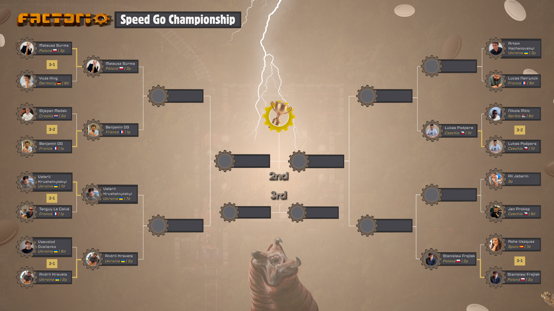 16 European top players competing in a fresh competition format – a single-elimination Bo5 knockout tournament - to compete for the title of Factorio Speed Go Champion. The tournament will be played on OGS (online-go.com).