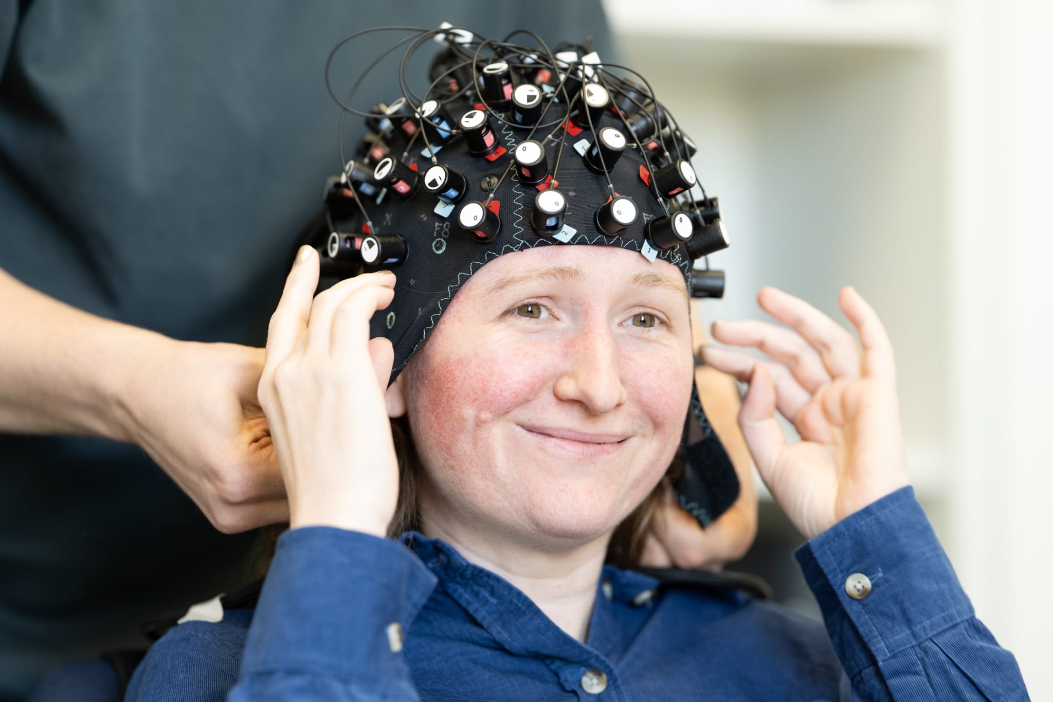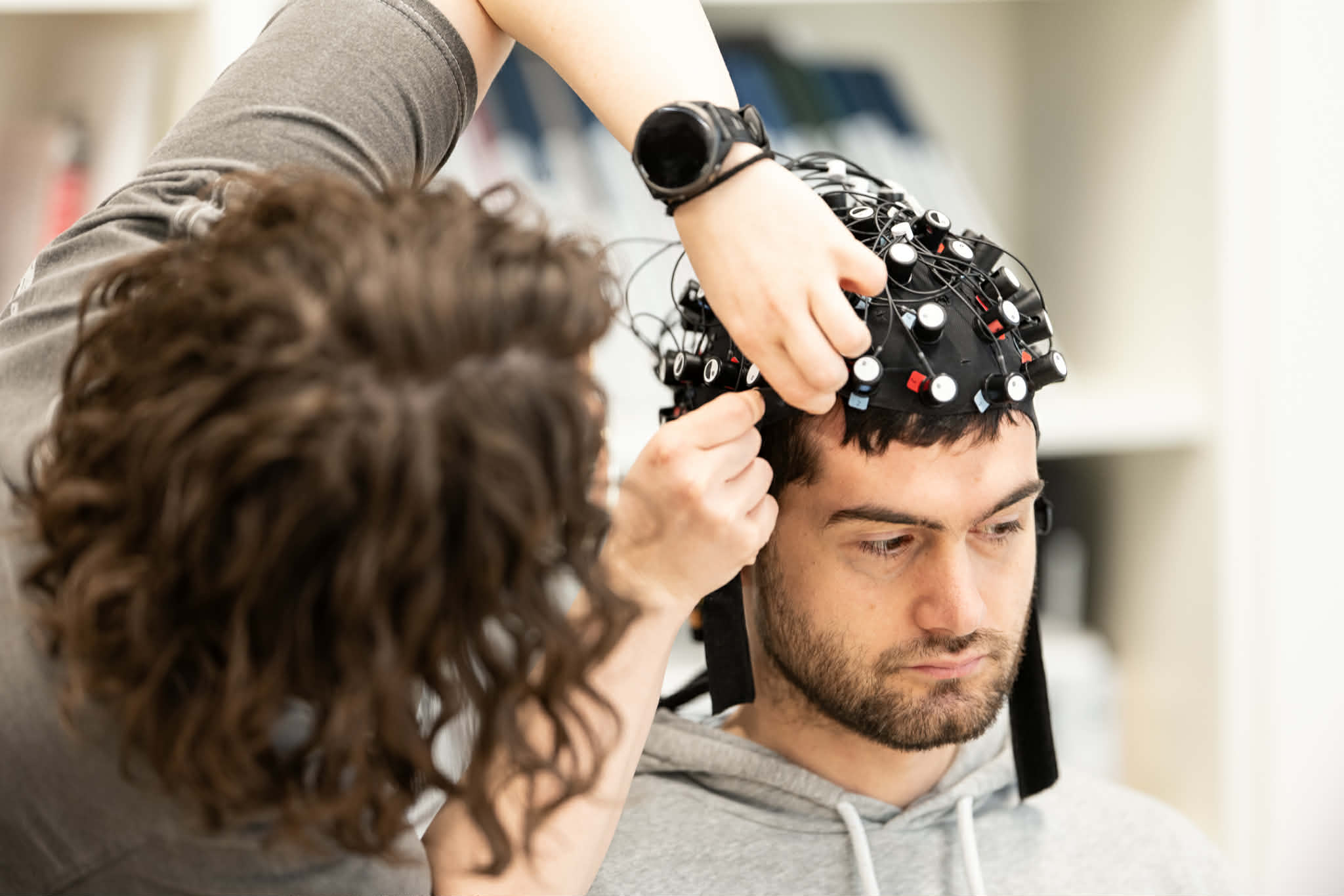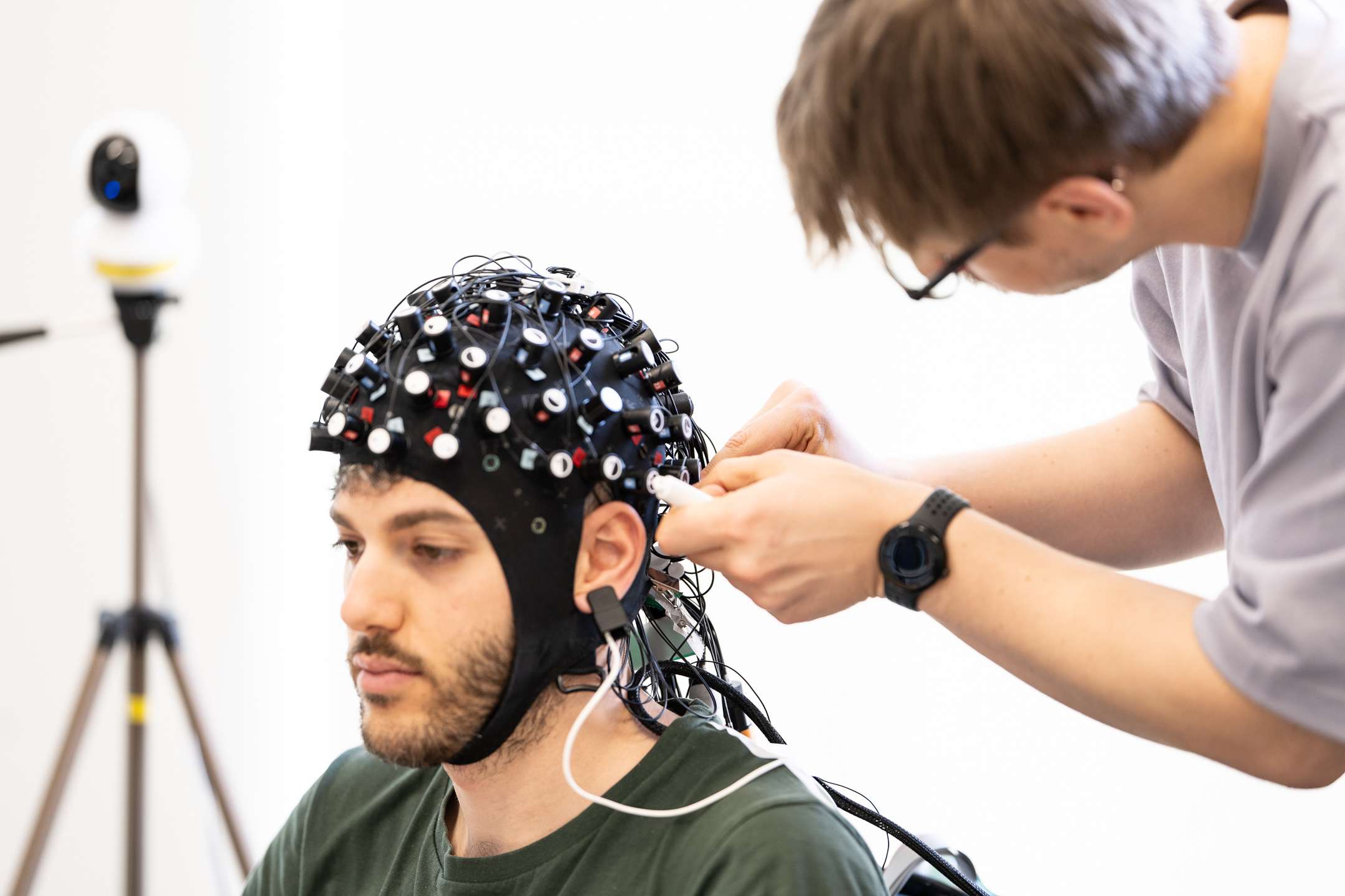 As you may have noticed during the streams, the players wear special equipments. One of them is that "funny hat", which is actually using fNIRS (functional near-infrared spectroscopy) technology, a brain imaging method using harmless light to measure changes in blood oxygenation in the brain (this is why the players have it covered by a black kind of shower hat, to stop external light from disturbing).