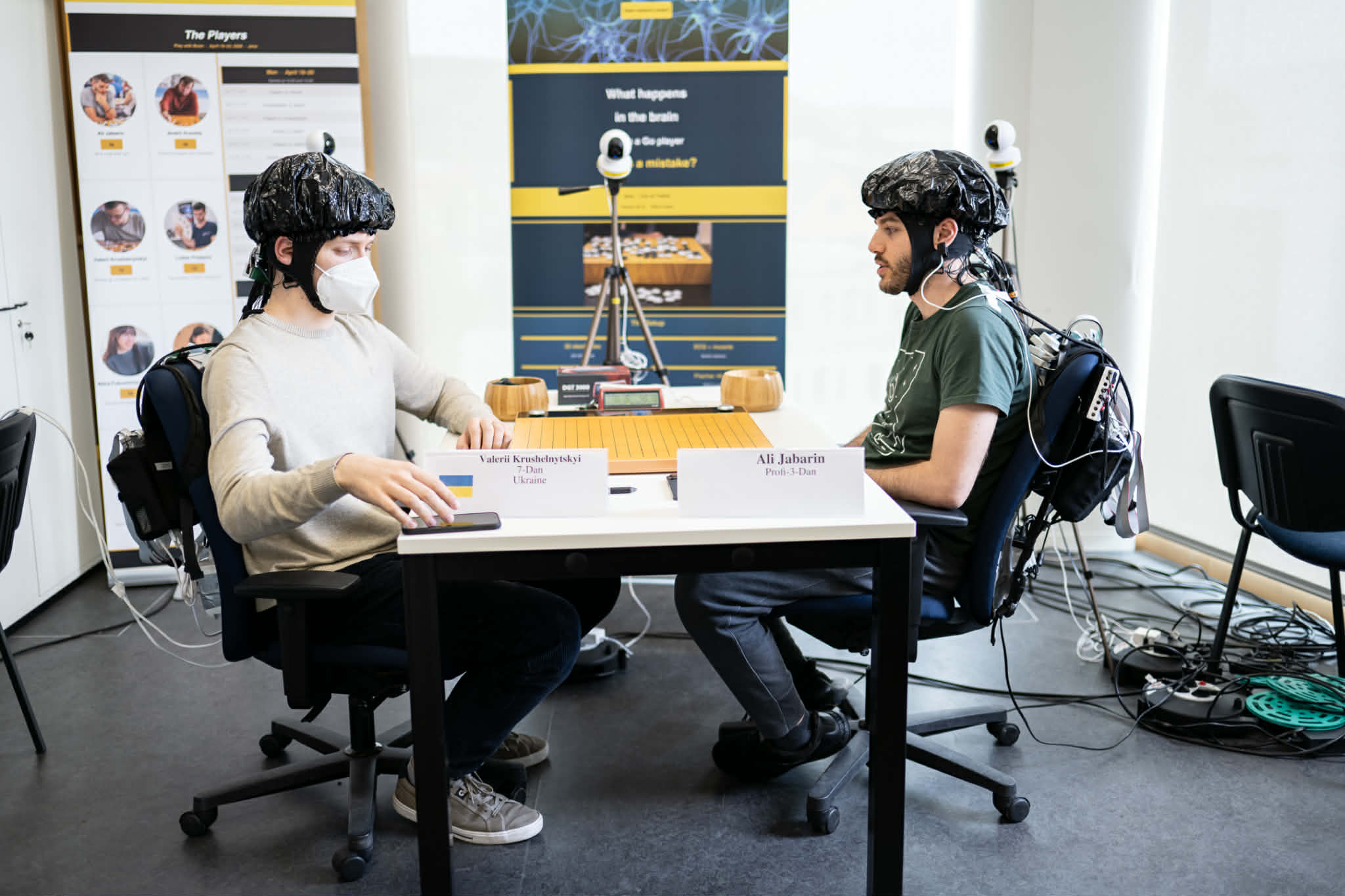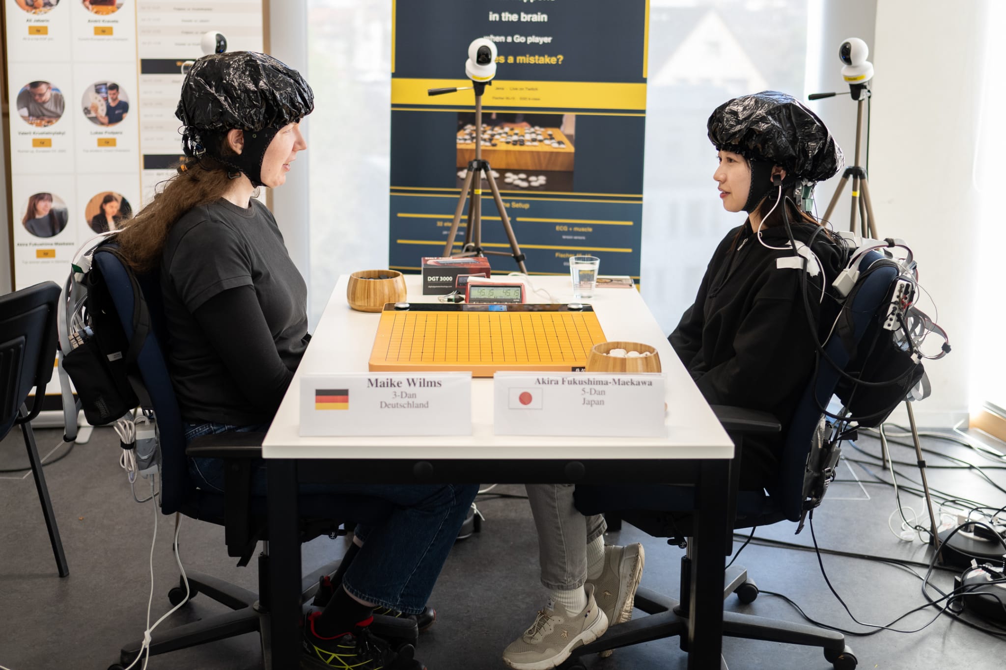 Each player is equipped with a sensor cap containing 32 electrodes that wirelessly sync with the Go boards, capturing brain activity throughout the game. Additionally, players wear an ECG monitor (three sensors on the chest) and a muscle tension sensor on the shoulder.