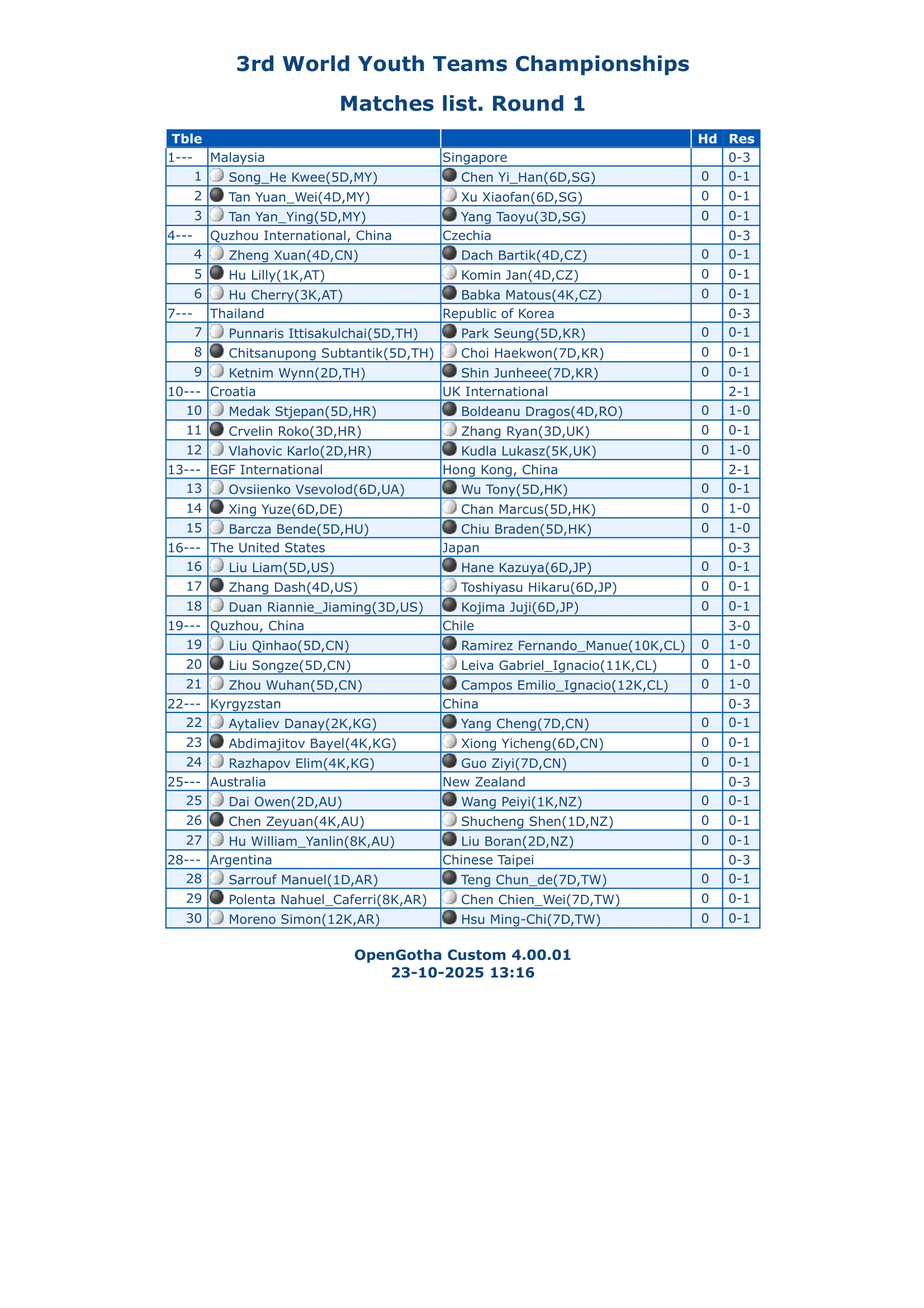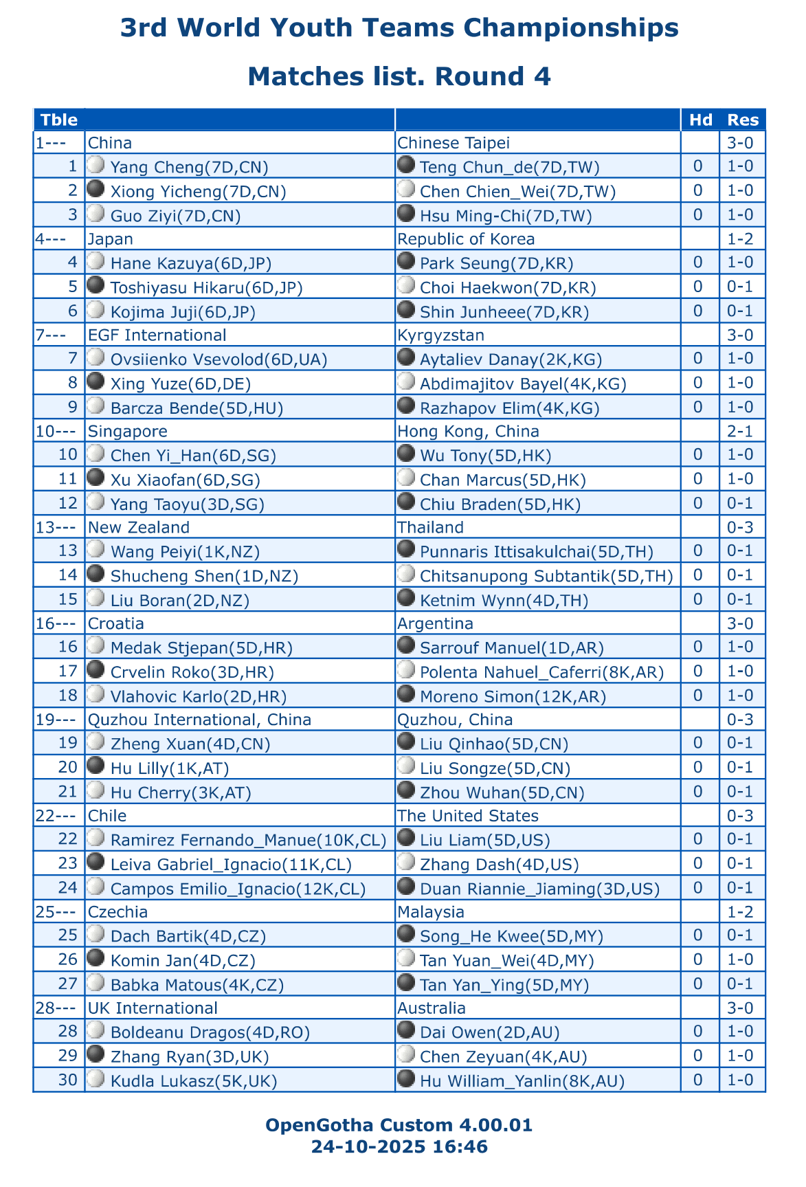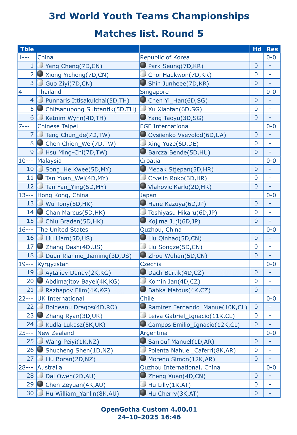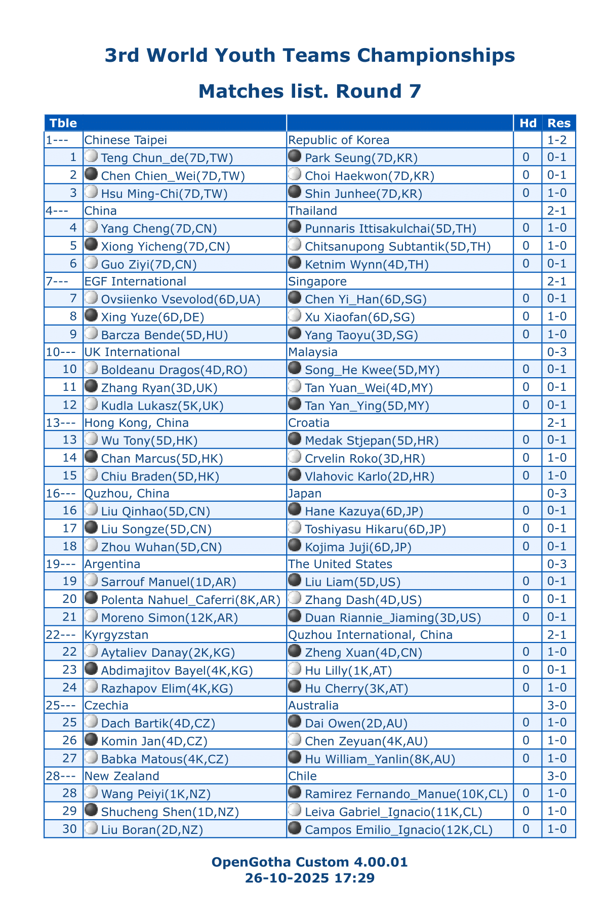 The highlights of the Youth Team Championships include the match between China and Japan (all games broadcast on yikeweiqi server) and the match between the EGF team and Croatia. Czechia is playing Thailand. The UK team led by Dragos Boldeanu from Romania is facing the U.S. team.
