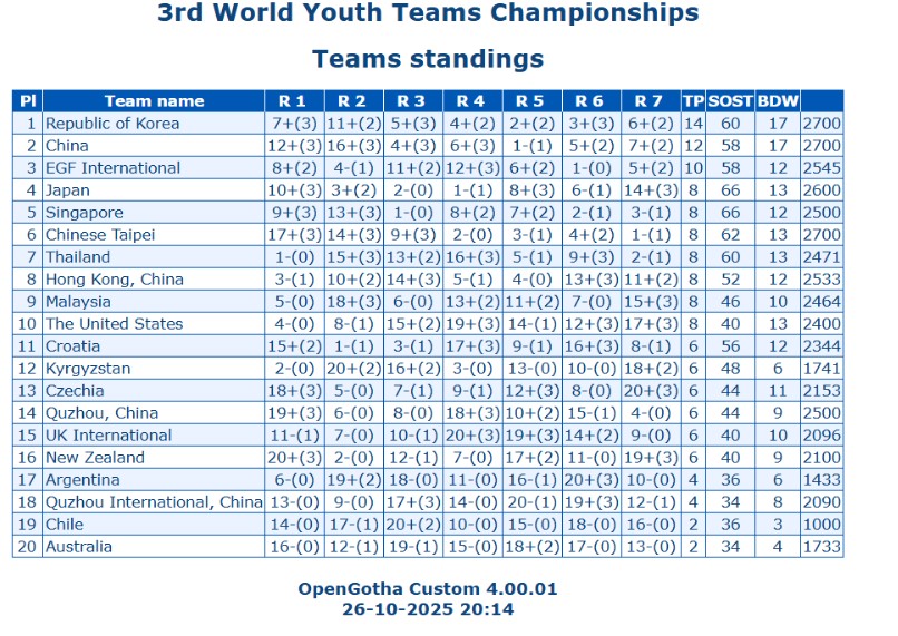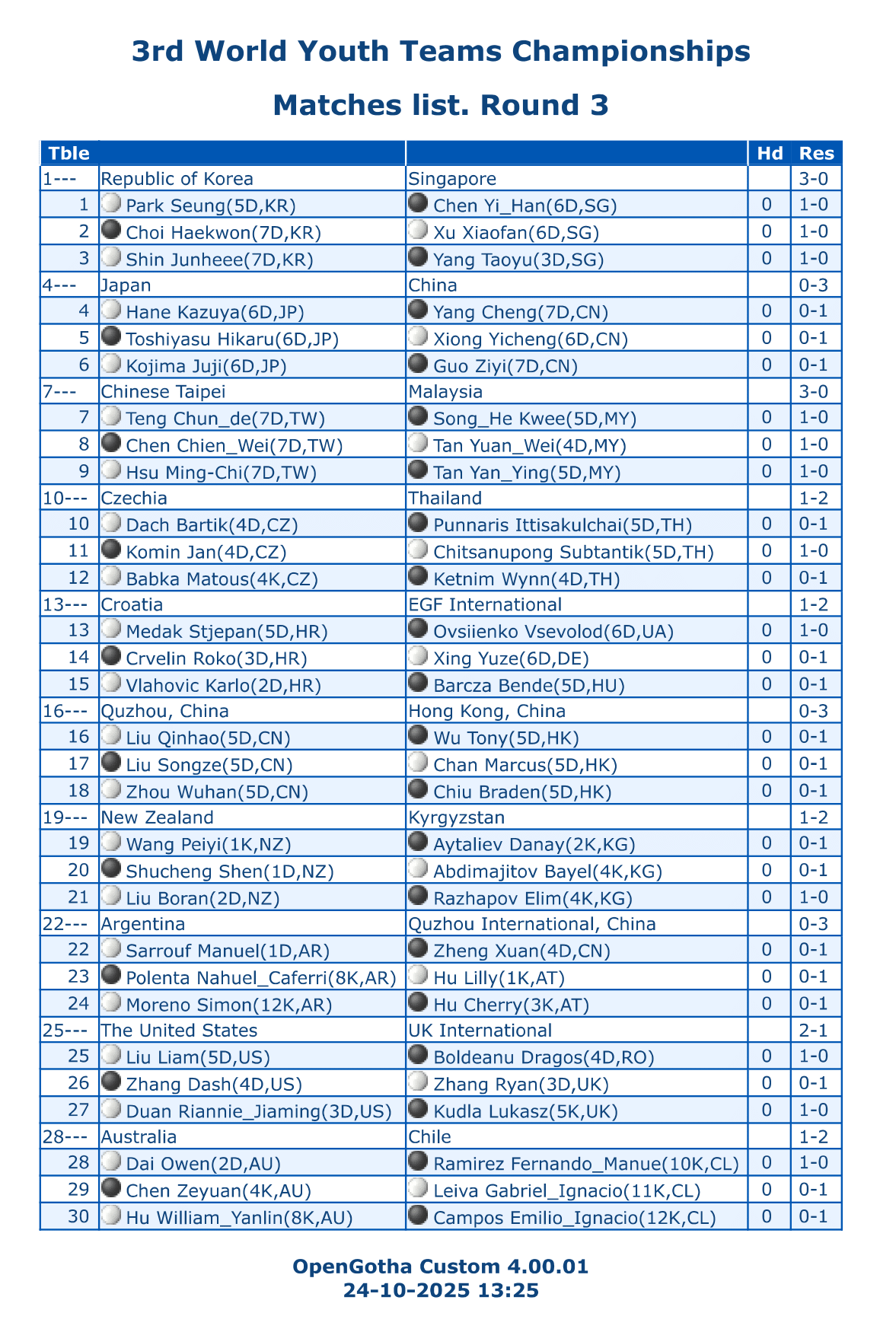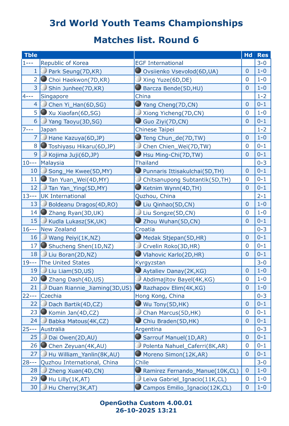 It is already clear that Republic of Korea is winning the tournament, even if they lose the last match to Chinese Taipei. The only team trailing by two match points is China, playing the match with Thailand, broadcast on yikeweiqi.com.