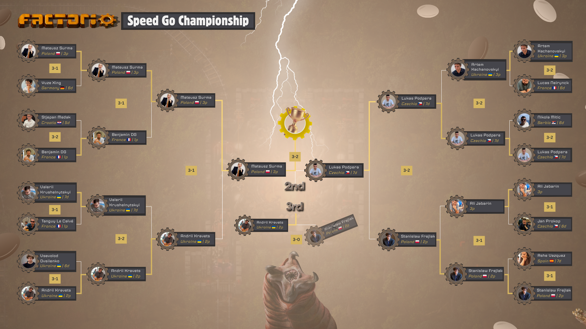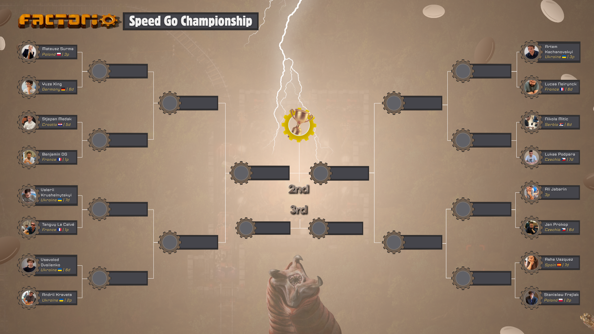16 European top players competing in a fresh competition format – a single-elimination Bo5 knockout tournament - to compete for the title of Factorio Speed Go Champion. The tournament will be played on OGS (online-go.com).